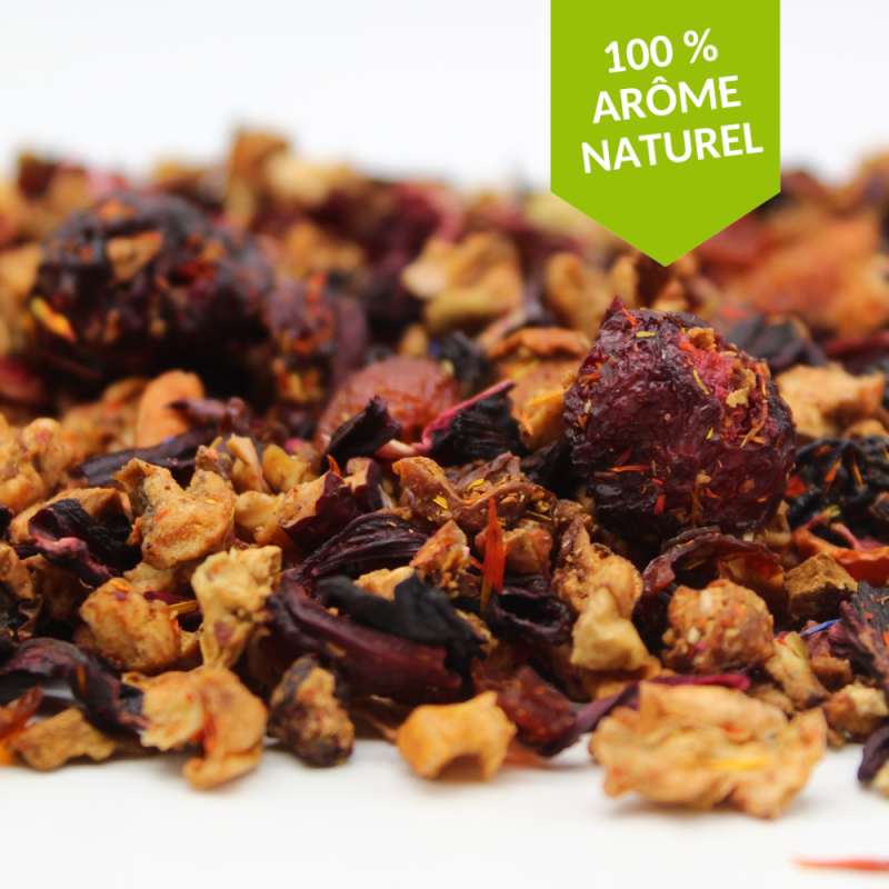 Ingrédient : pomme, hibiscus, cynorrhodon, arômes naturels, cerise 3% (cerise, jus de pomme, huile de tournesol), fleurs de bleuet, cerise 1%, fleurs de carthame.
