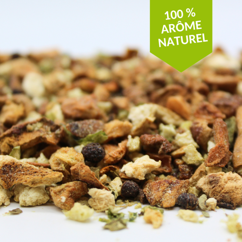 Ingrédients : Pomme, hibiscus, écorce d'orange 6%, papaye (papaye, sucre), arômes naturels, cynorrhodon, écorce d'orange confite 3% (sirop de maïs, orange, sel), passiflore, fleurs d'oranger, fruit de la passion 1%.