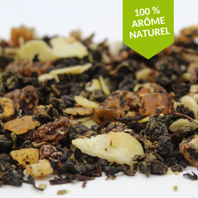 Ingrédients : thé milky Oolong 10%, praline 25,5% (sucre, AMANDES, sirop de glucose, concentrés de radis, citron, cassis), fèves tonka, AMANDES, tulsi, pétales de carthame.