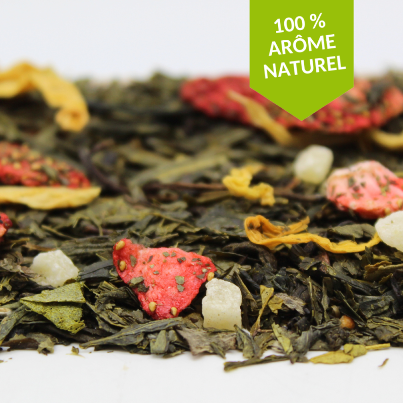 Ingrédients : Thé vert Sencha de Chine , ananas 11% (ananas, sucre), arômes naturels, abricot 4% (abricot, farine de riz), papaye (papaye, sucre), rose, mauve, myrtille (myrtille, jus de pomme, huile de tournesol), fraises.