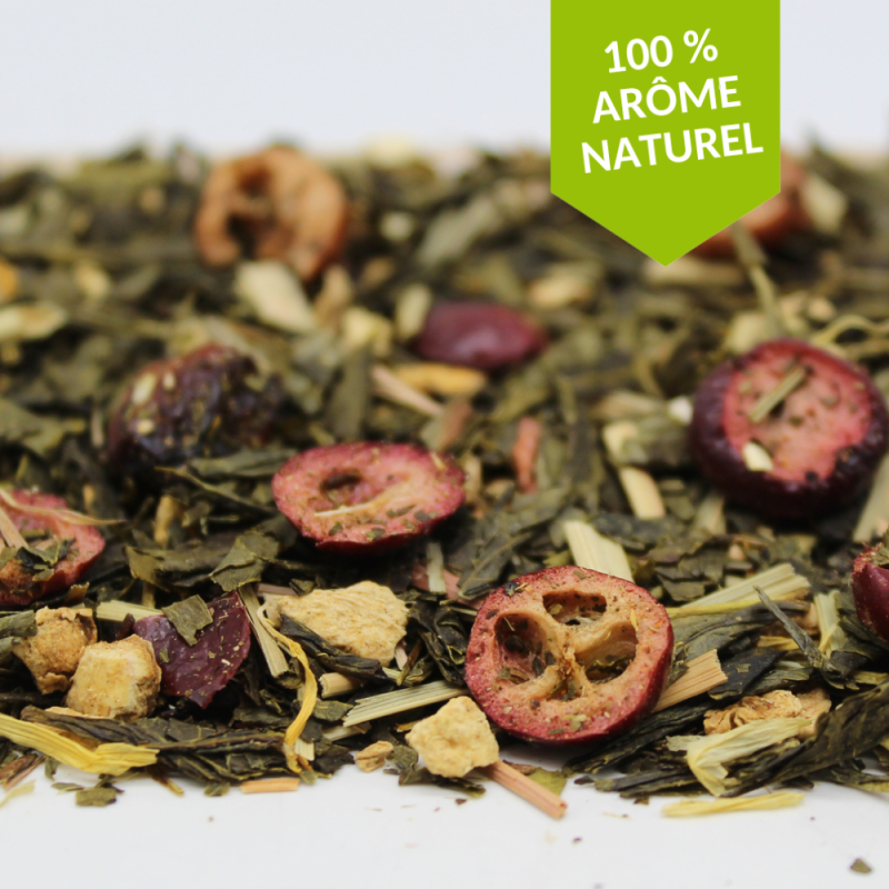 Ingrédients :Thé vert de Chine Sencha, citronnelle, gingembre 11%, fleurs de souci, arôme naturel, canneberge* 1%.