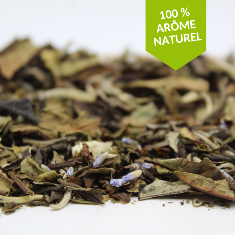 Ingrédients : Thé vert China Chun Mee, thé blanc Pai Mu Tan, lavande 3%, arôme naturel, bourbon vanille 1%.
