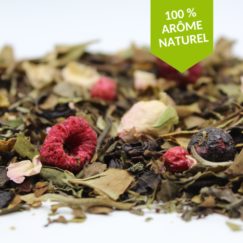 Ingrédients : Thé blanc Pai Mu Tan. thé vert de Chine sencha. pétales de rose. arôme naturel. groseilles. cassis. boutons de rose. framboises entières. baies d'aronia