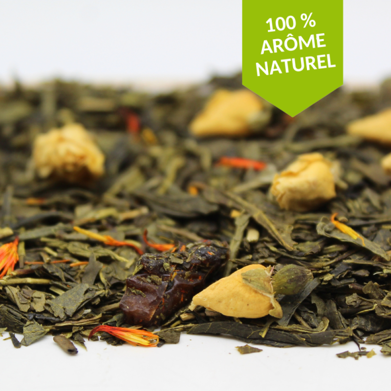 Ingrédients : Thé* vert de Chine Sencha, arôme naturel, fleurs de souci*, pêche* 2%.