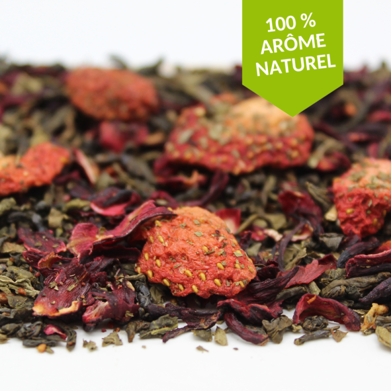 Ingrédients : Thé vert de Chine Sencha, arômes naturels, fraise 2%, framboise 2%, rose.