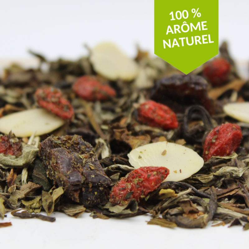 Ingrédients : thés blancs, poire 14.45%, mirabelle 14.45%, AMANDES, baies de goji, arômes naturels.