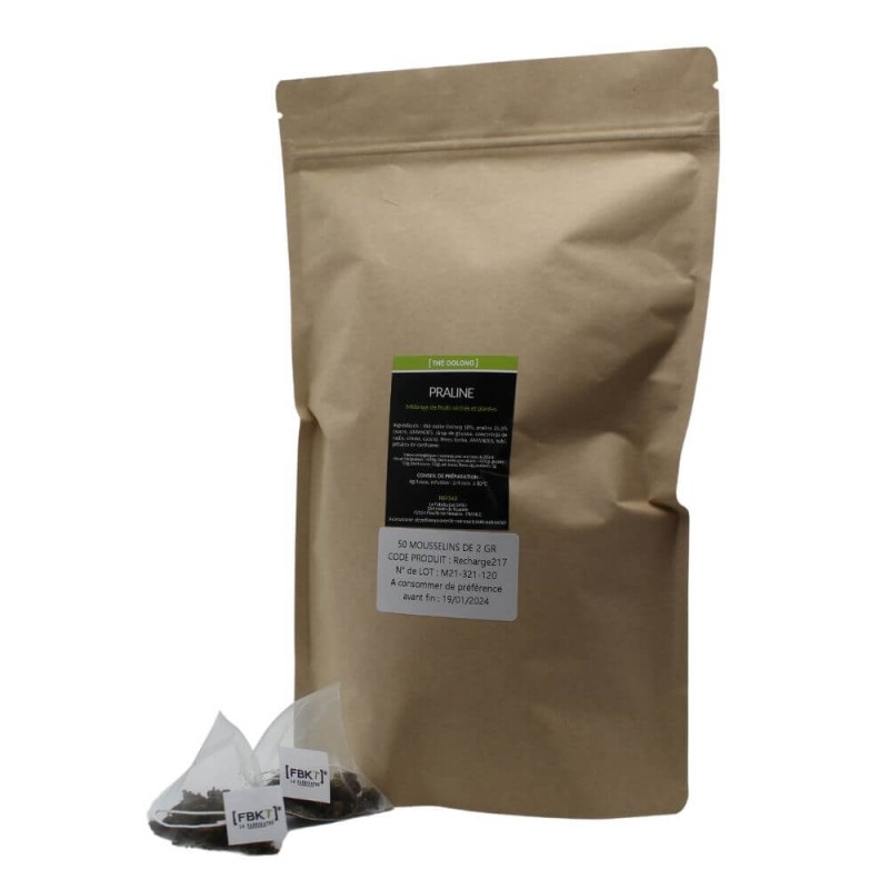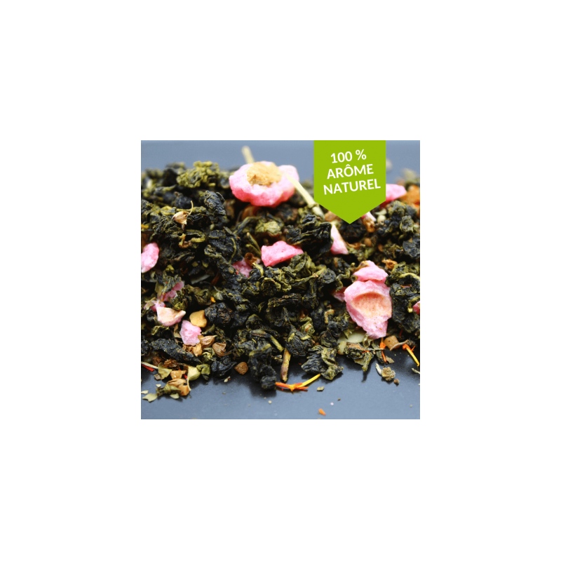 Ingrédients : Thé milky Oolong 10%, praline 25,5% (sucre, AMANDES, sirop de glucose, concentrés de radis, citron, cassis), fèves tonka, AMANDES, tulsi, pétales de carthame.