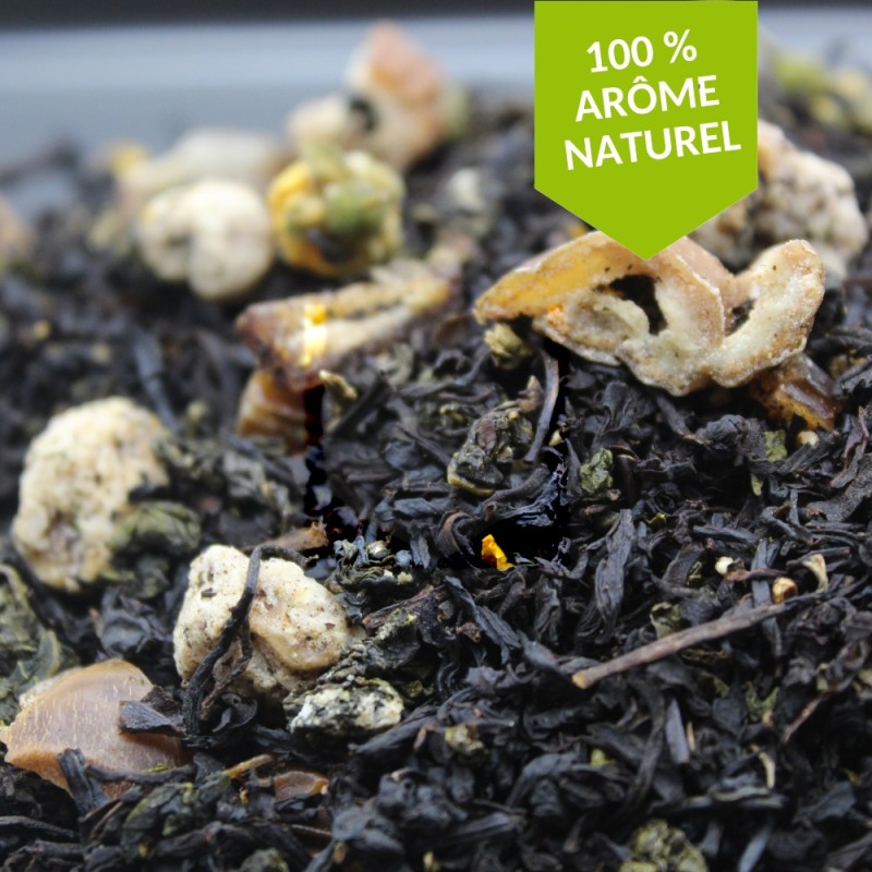 Ingrédients : Thé Oolong, écorce d'orange confite 13,8% (sirop de maïs, écorce d'orange, sel), écorce d'orange 11,5%, arôme naturel.